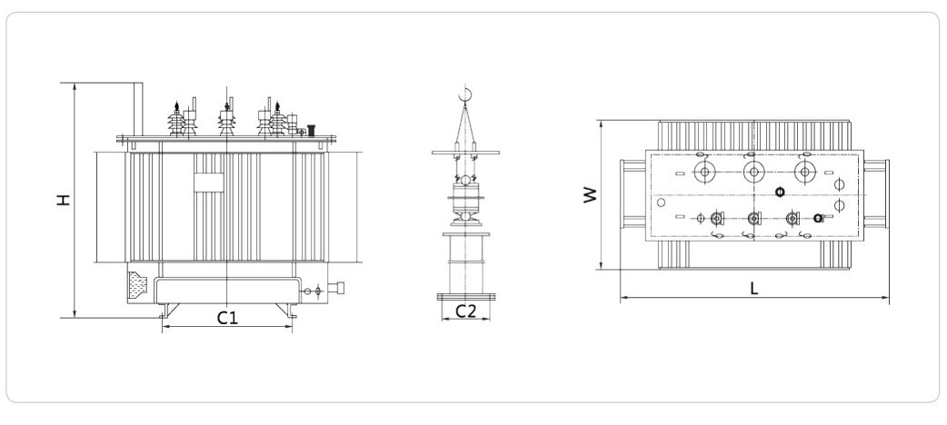 繞組采用瓦楞油道,不浸漆工藝,緊縮帶綁扎。繞組均為同心式線圈,高壓繞組具有對應分接電壓要求的抽頭,引至分接開關上,開關安裝在箱蓋上,且需切斷電源后方可變換分接電壓。