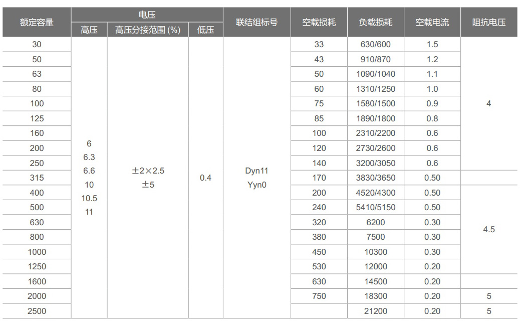 注4:根據(jù)用戶需要,可提供其他高壓分接范圍的三相變壓器。
